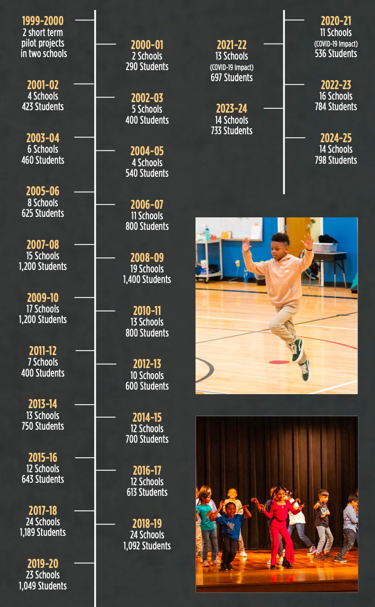 Modeled after the National Dance Institute (NDI) Program in New York City founded in 1970’s by Jacques D’Amboise, a former principal dancer with New York City Ballet, Kansas City Ballet’s R.O.A.D. Residency program was initiated in 2000 by KC Ballet’s Community Education Department. Initially piloted in two public schools, Primitiva Garcia Elementary in Missouri and Broken Arrow Elementary in Kansas, this program was the first of its kind in Missouri and Kansas.
